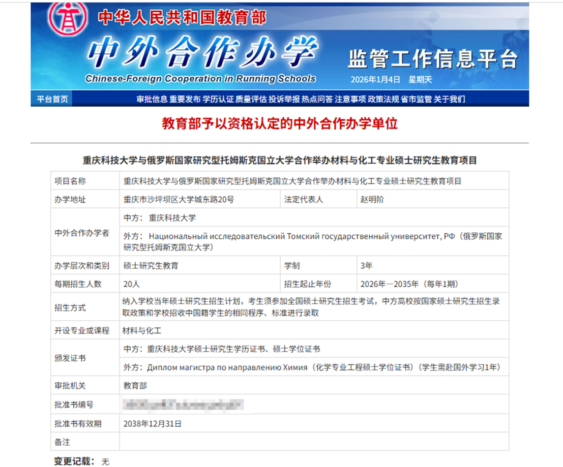 近日,教育部公布了2025年下半年中外合作办学项目审批结果,我院与俄罗斯国家研究型托姆斯克国立大学合作举办的材料与化工专业硕士研究生教育项目成功获批。该项目是全校获批的首个硕士研究生层次中外合作办学项目,标志着我校国际化办学实现新突破,对推动学校加快建设特色鲜明的高水平应用研究型大学具有重要战略意义。