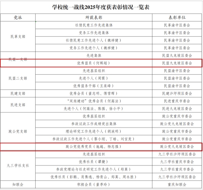 近日,各民主党派、统战团体上级组织通报表彰了2025年度统战各领域工作成果。学校统一战线基层组织、统战成员凝心聚力、携手前进,在参政议政、社会服务和组织建设等方面争先创优,积极作为,我院何辉超老师荣获民盟优秀盟员、施越老师荣获致公党优秀党员。