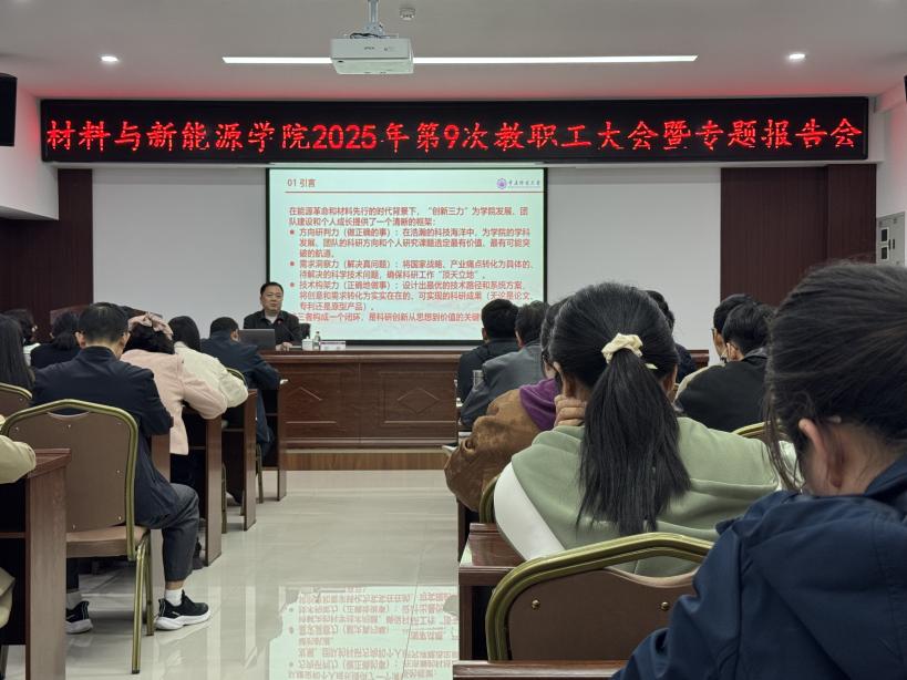 11月6日下午,材料与新能源学院在知行楼M508会议室召开2025年第9次教职工大会暨专题报告会。学校党委常委、副校长周雄作题为“创新三力——材料与新能源领域的科研破局之道”的专题报告。学院全体教职工和部分研究生代表参加会议,党总支书记都进学主持会议。