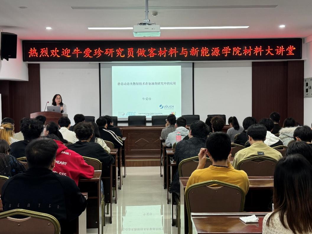 3月30日下午,德国于利希研究中心牛爱珍研究员应邀做客“材料大讲堂”,为学院师生作了“静态动态光散射技术在驱油剂研究中的应用”主题学术报告,学院青年教师、研究生及本科生代表参加报告会,院长韩涛主持报告会。